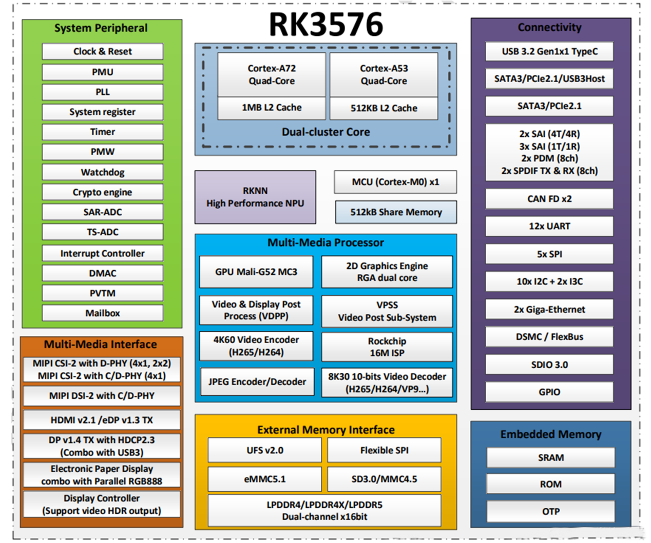 „RockChip RK3576“ antros kartos 8 nm aukšto našumo AIOT platforma yra didelio našumo, mažos galios SOC (sistemos ant mikroschemos) procesorius, tinkamas įvairiems taikymo scenarijams, tokiems kaip ARM pagrįsti kompiuteriai, kraštų skaičiavimo įrenginiai ir asmeniniai mobiliųjų interneto prietaisai. Jis naudoja aštuonių branduolių procesorių, pagrįstą ARM architektūra, integruoja nepriklausomą 6TOPS (TERA operacijų per sekundę) NPU (neuroninio tinklo keturračių apdorojimo bloką), integruojami keli skaičiavimo branduoliai, tokie kaip GPU, MCU, VPU, ir turi turtingą periferinę sąsają, kad atitiktų sudėtingus scenos reikalavimus daugybe. Be to, RK3576 taip pat palaiko UFS (universalią „Flash“ saugyklą) saugyklą, užtikrinančią efektyvias duomenų saugojimo ir skaitymo galimybes.
